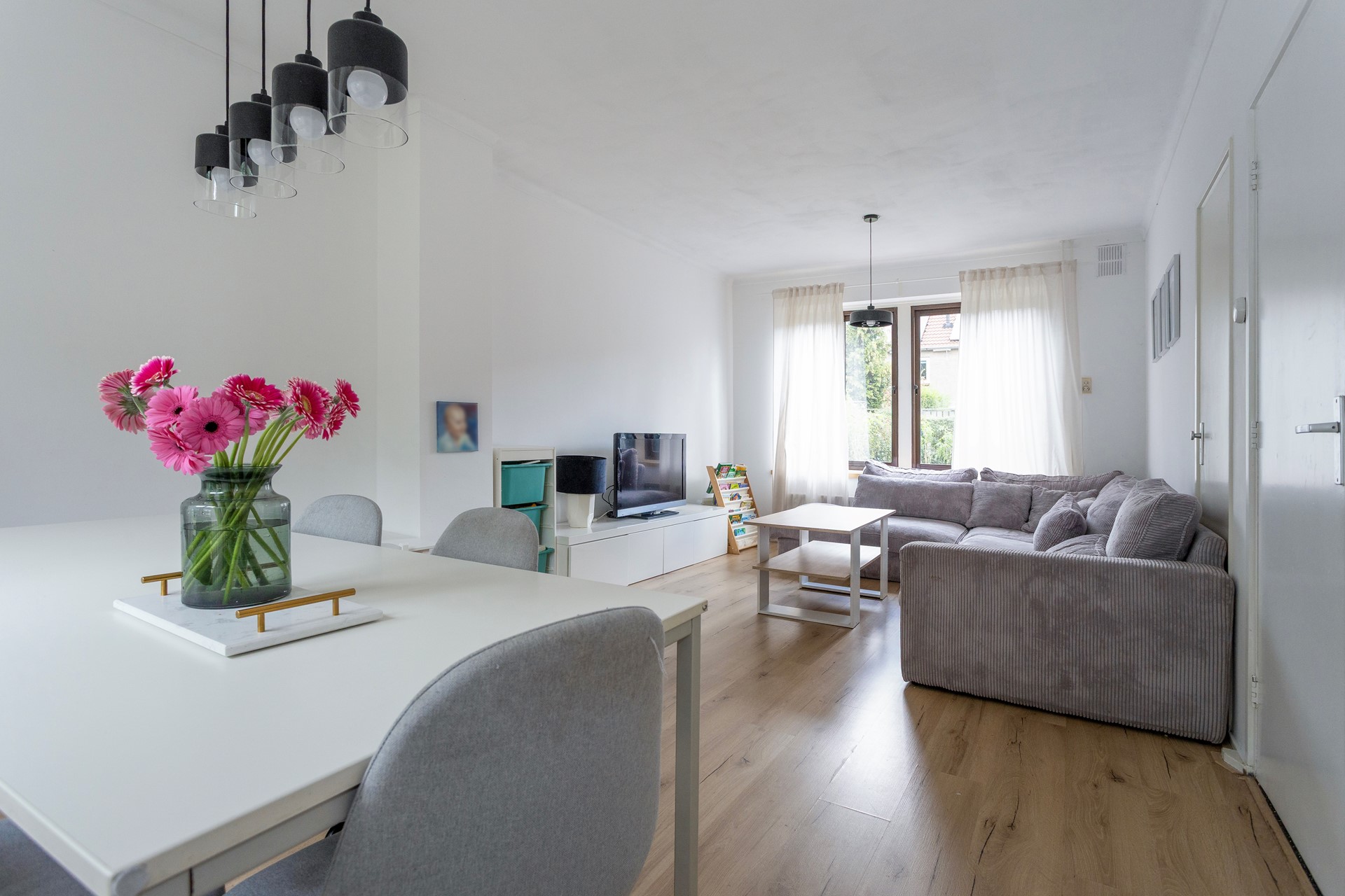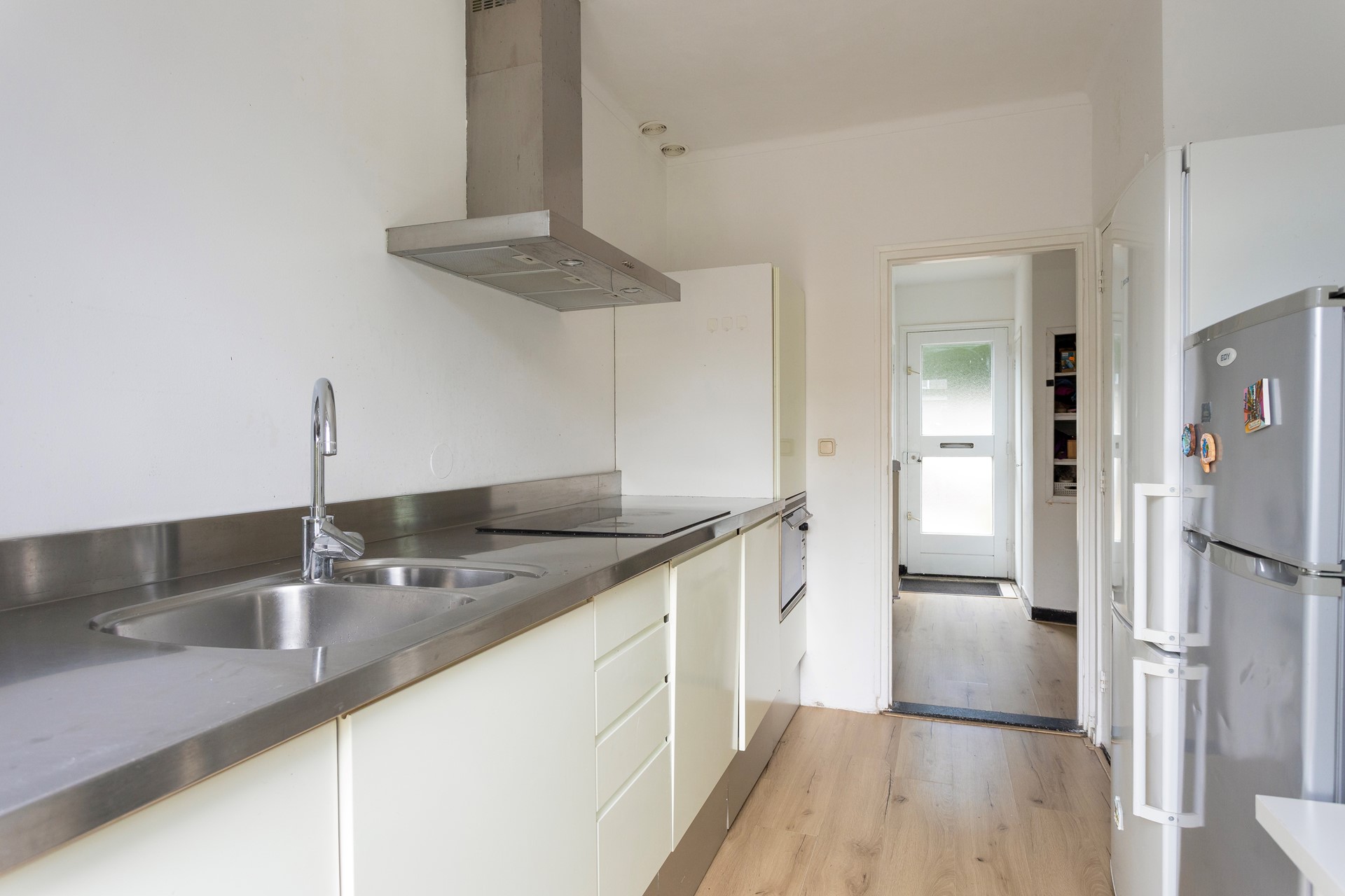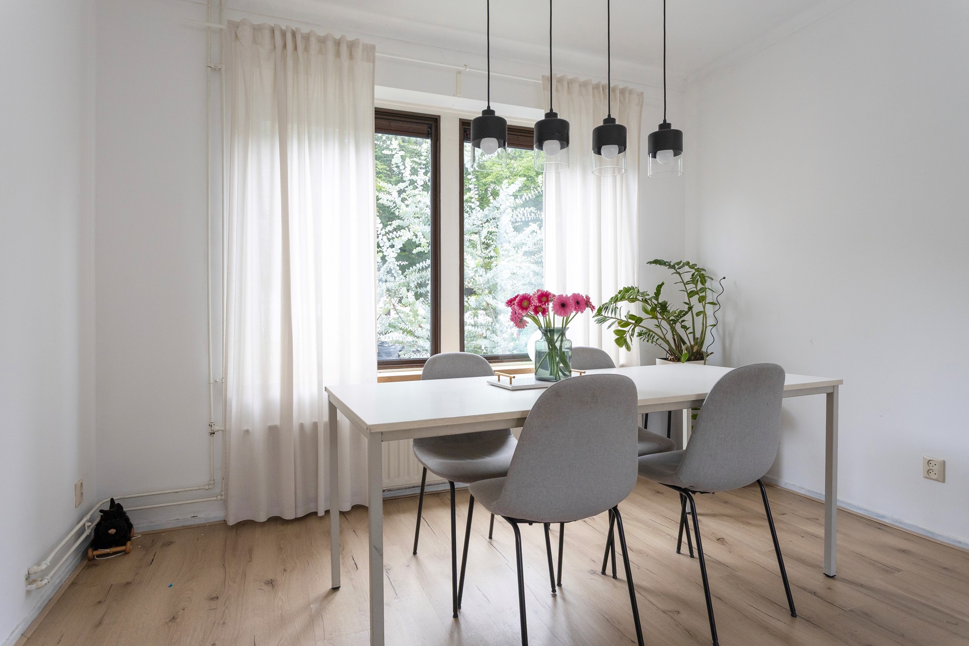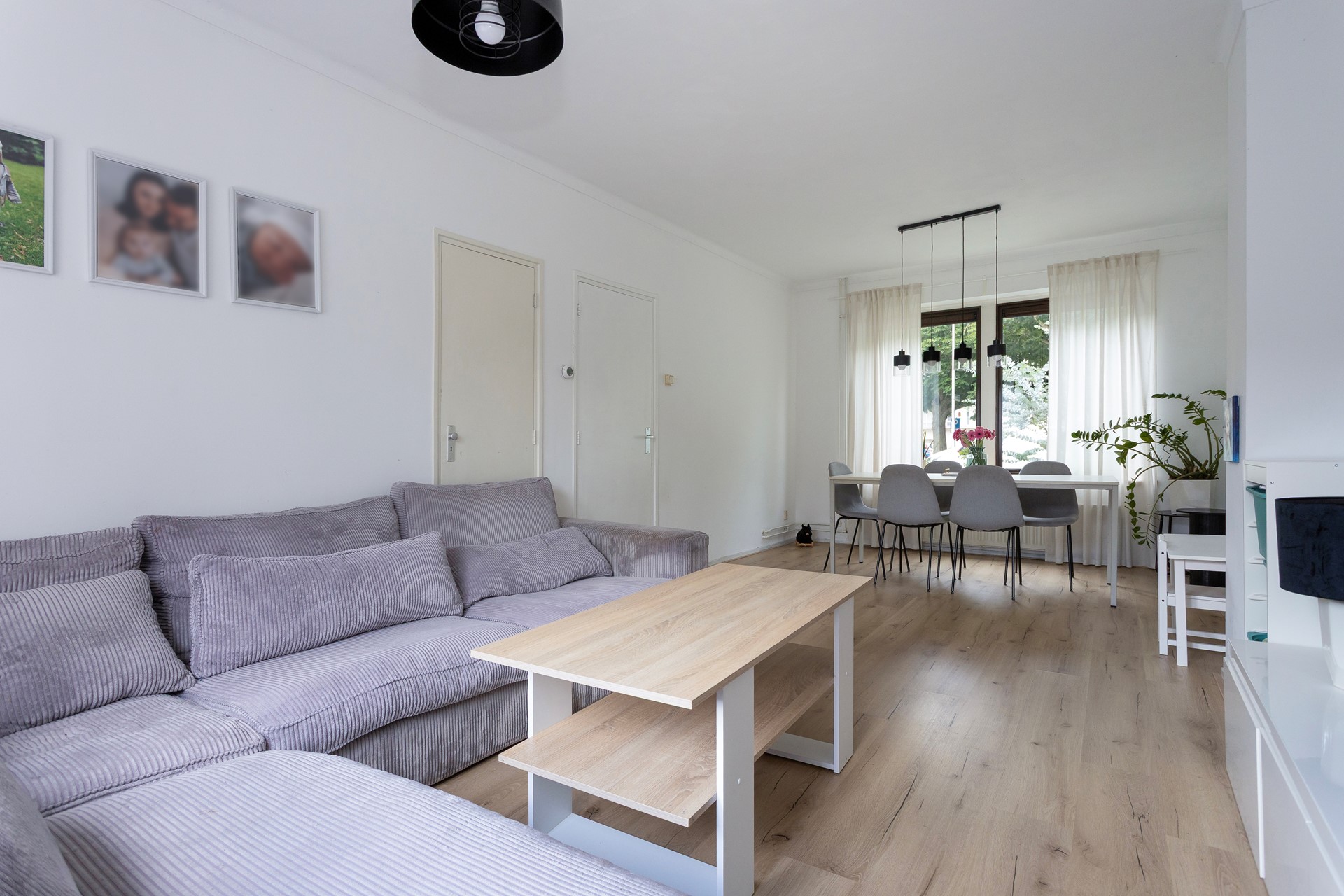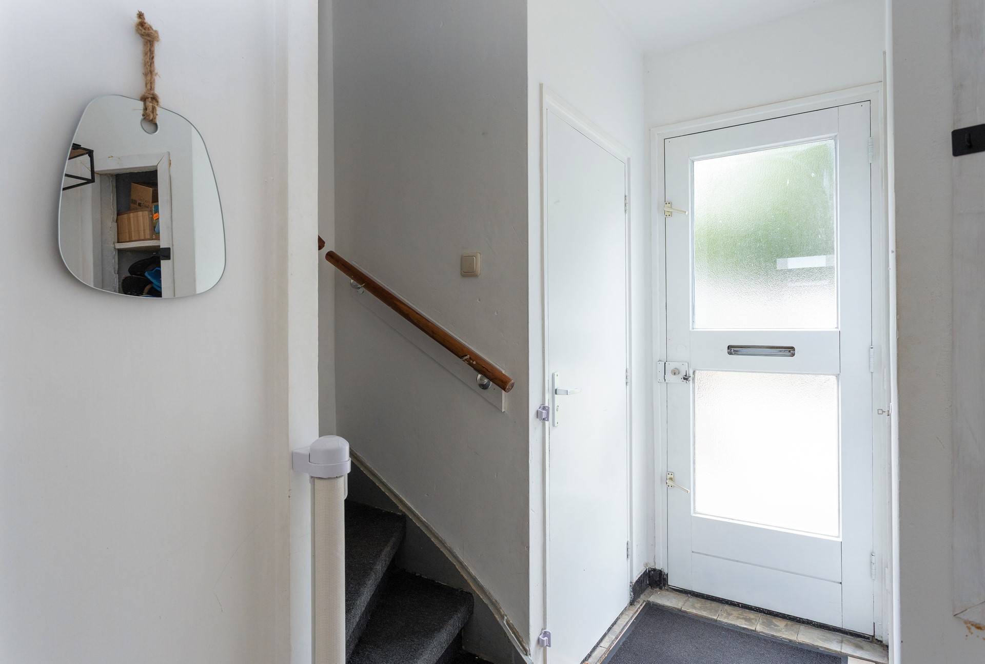 De entree biedt toegang tot de hal van de woning. In de hal vindt u de meterkast (7 groepen, kookgroep en 2 aardlekschakelaars), een kelderkast, de trapopgang naar de eerste verdieping en de toiletruimte. Via de hal komt u in de woonkamer en de keuken. In de doorzonwoonkamer is voldoende ruimte voor het plaatsen van zowel een zit- als een eethoek. Door de grote ramen in de woonkamer is er veel lichtinval. De keuken is ingericht met een modern keukenmeubel in een witte kleur met een rvs werkblad, v.v. een inductiekookplaat, afzuigkap, magnetron en vaatwasser. Er is voldoende ruimte voor plaatsen koelkast en vriezer, ook is de keuken v.v. een vaste inbouwkast. Alle plafonds en wanden op de begane grond zijn voorzien van stucwerk, op de vloeren ligt laminaat (2023 nieuw) met een houtprint.