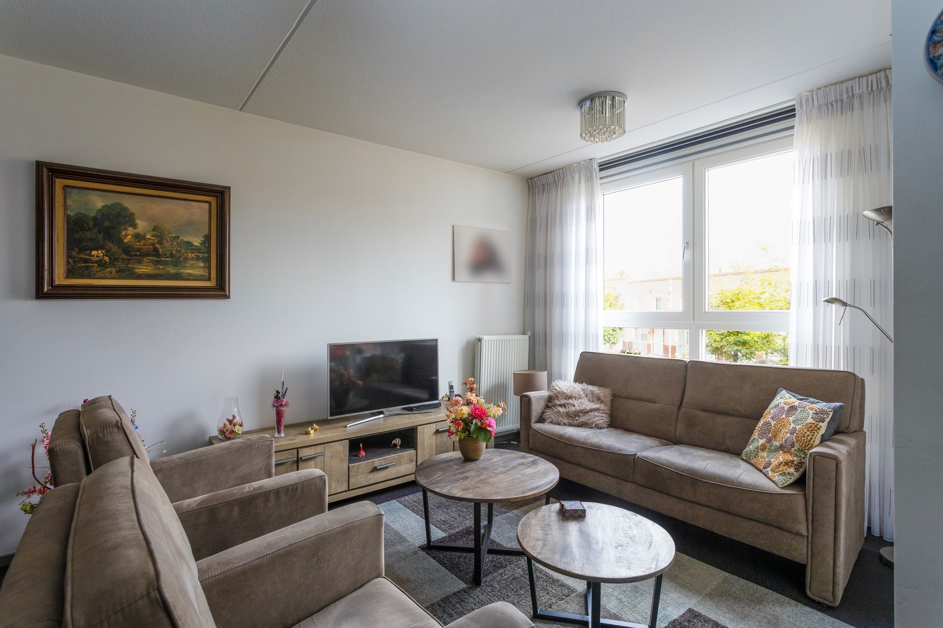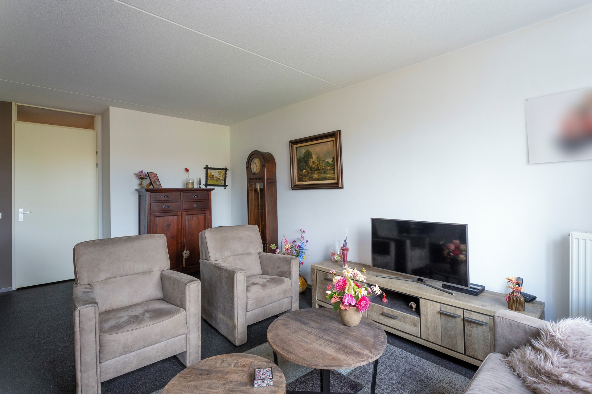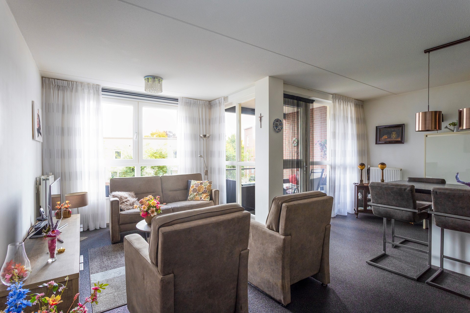 • ruime woonkamer met veel lichtinval, toegang tot loggia/balkon; de vloer is v.v. donker gekleurde siergrind, de muren en plafonds zijn in lichte kleuren afgewerkt