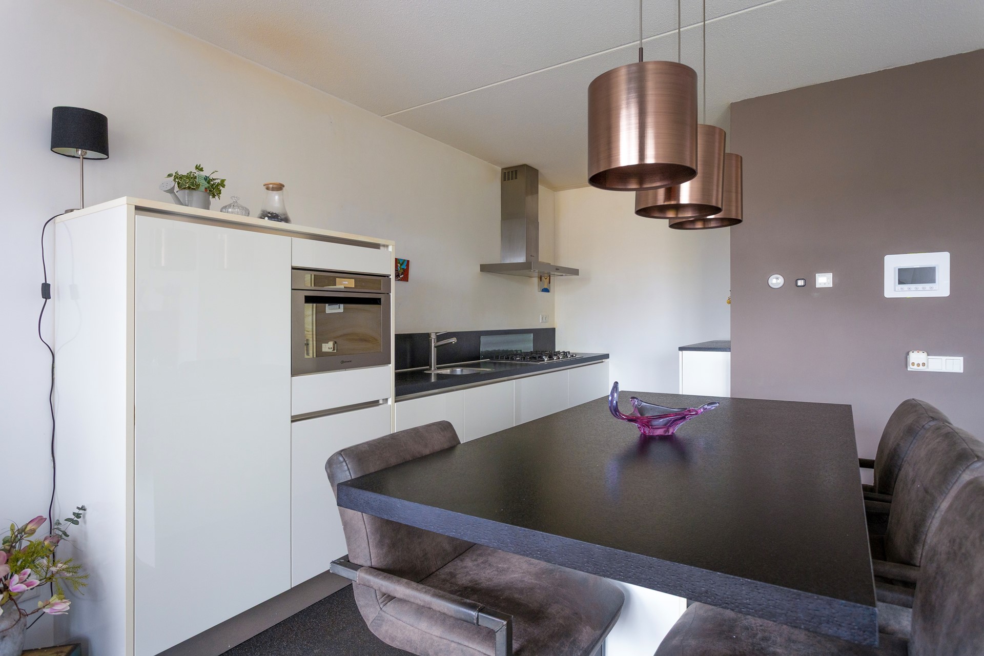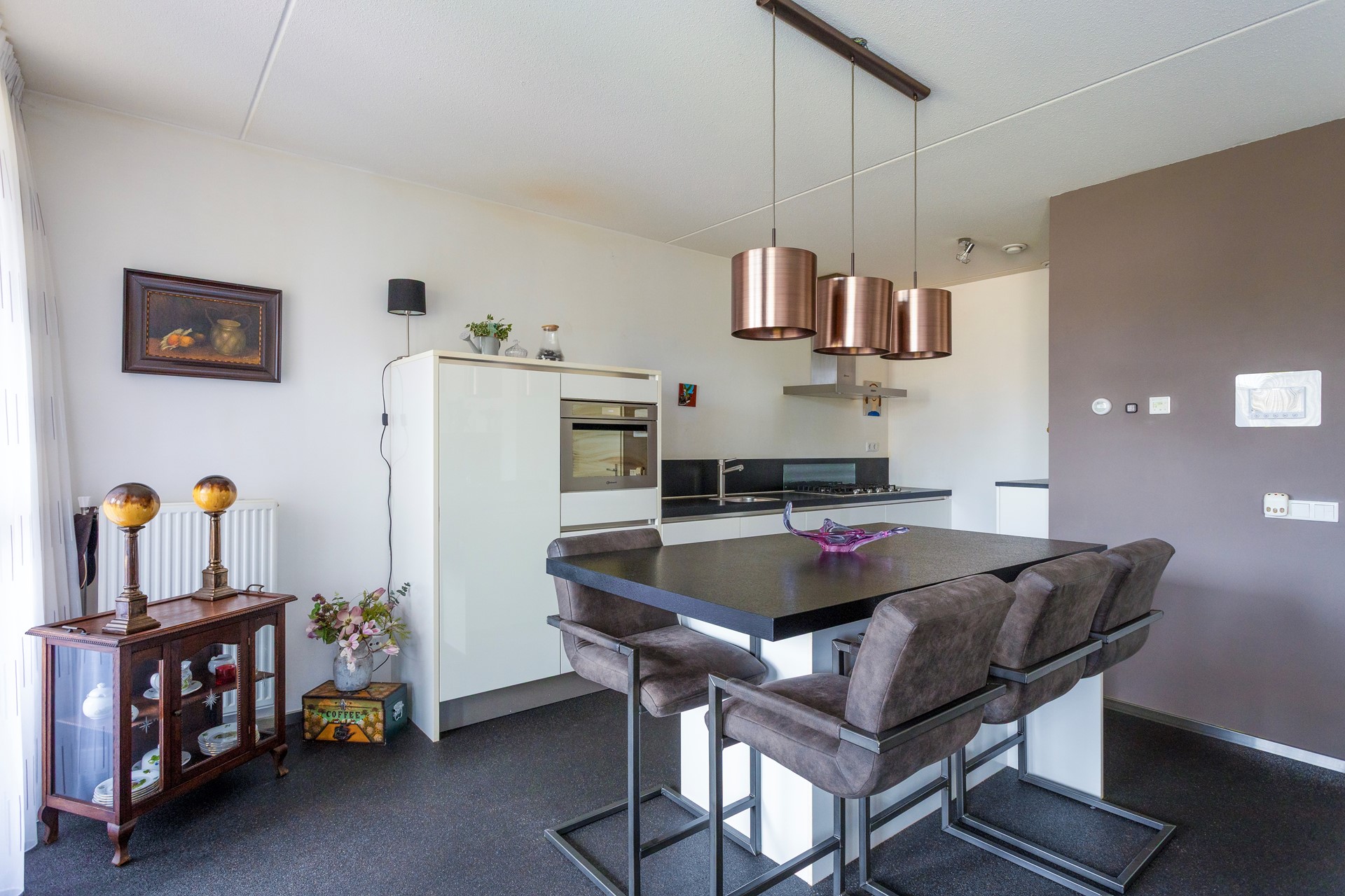 • open keuken v.v. keukenmeubel met spoelbak, 5 pits gaskookplaat, schouwmodel afzuigkap, combi-magnetron, vaatwasser en koelkast in hoogglans witte kleurstelling met een zwart kunststof werkblad, ook is de keuken v.v. een vast ziteiland met plaats voor 6 stoelen; de vloer is v.v. donker gekleurde siergrind, de muren en plafonds zijn in lichte kleuren afgewerkt