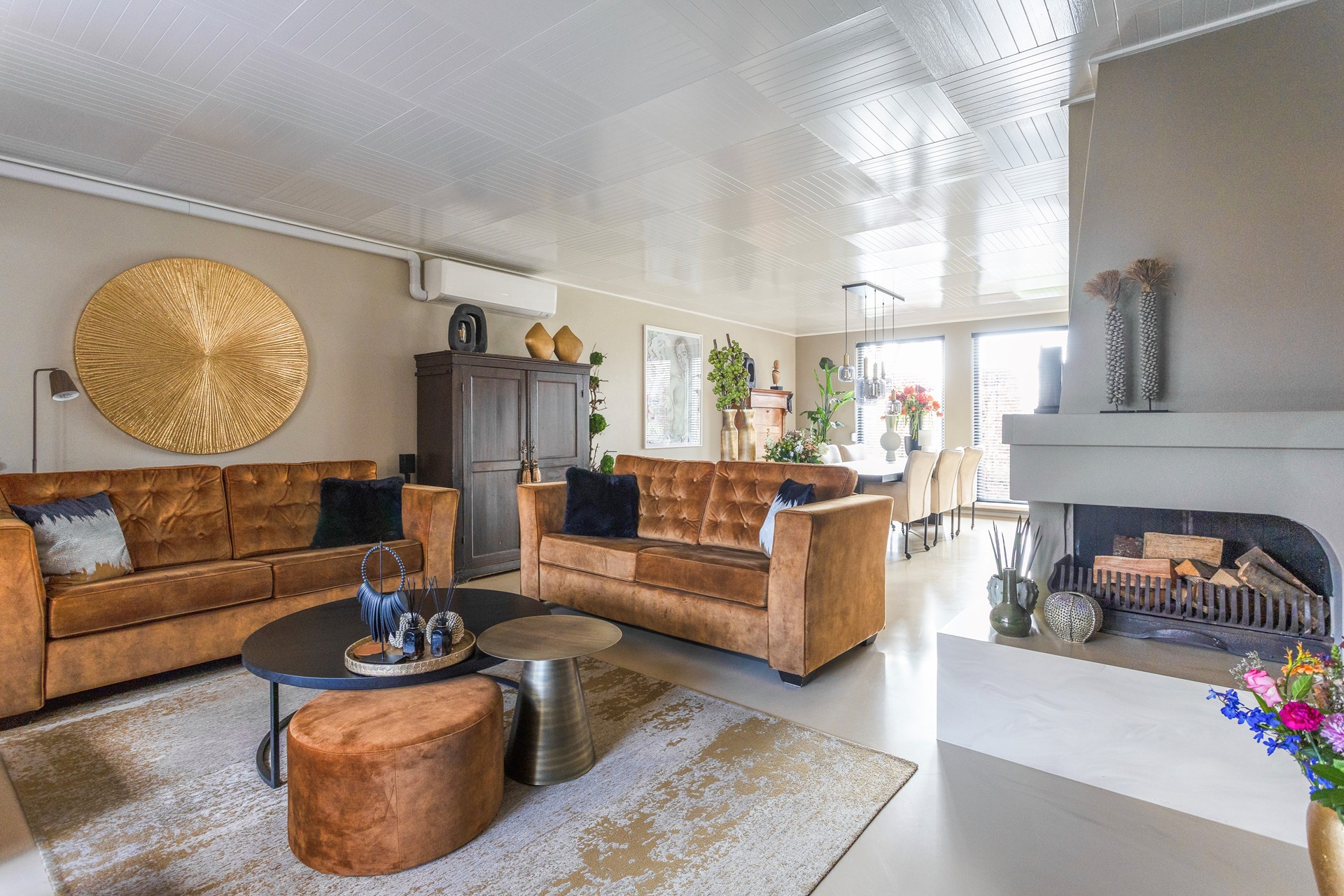 • Ruime L vormige woon- en eetkamer met open haard, een airco welke voor verwarming en koeling kan zorgen