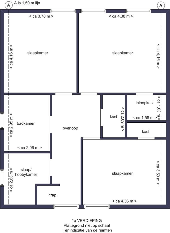 • Slaapkamers van ca. 23 m² (incl. inloopkast), twee kamers van ca. 16 m² (waarvan één met inbouwkast) en een kamer van ca. 6 m²