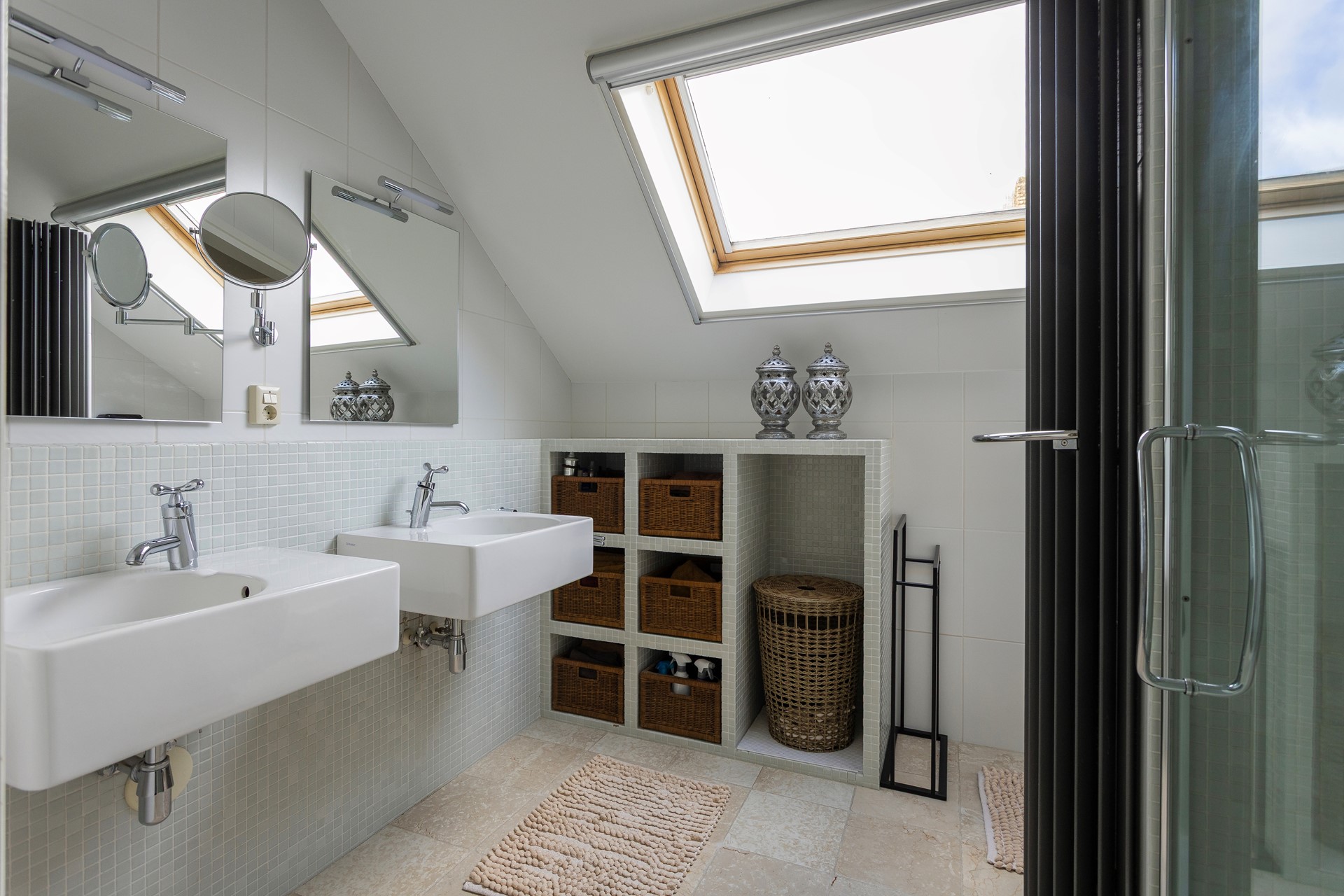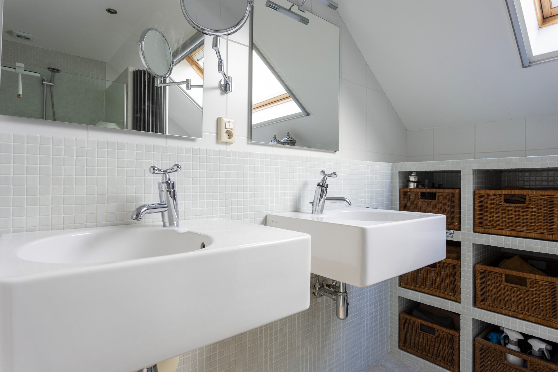 • Badkamer volledig betegeld in wit en uitgerust met een royale inloopdouche, een dubbele wastafel met meubel, een vrijhangend toilet en een urinoir