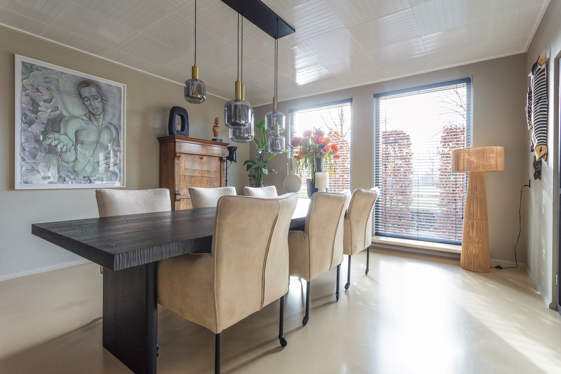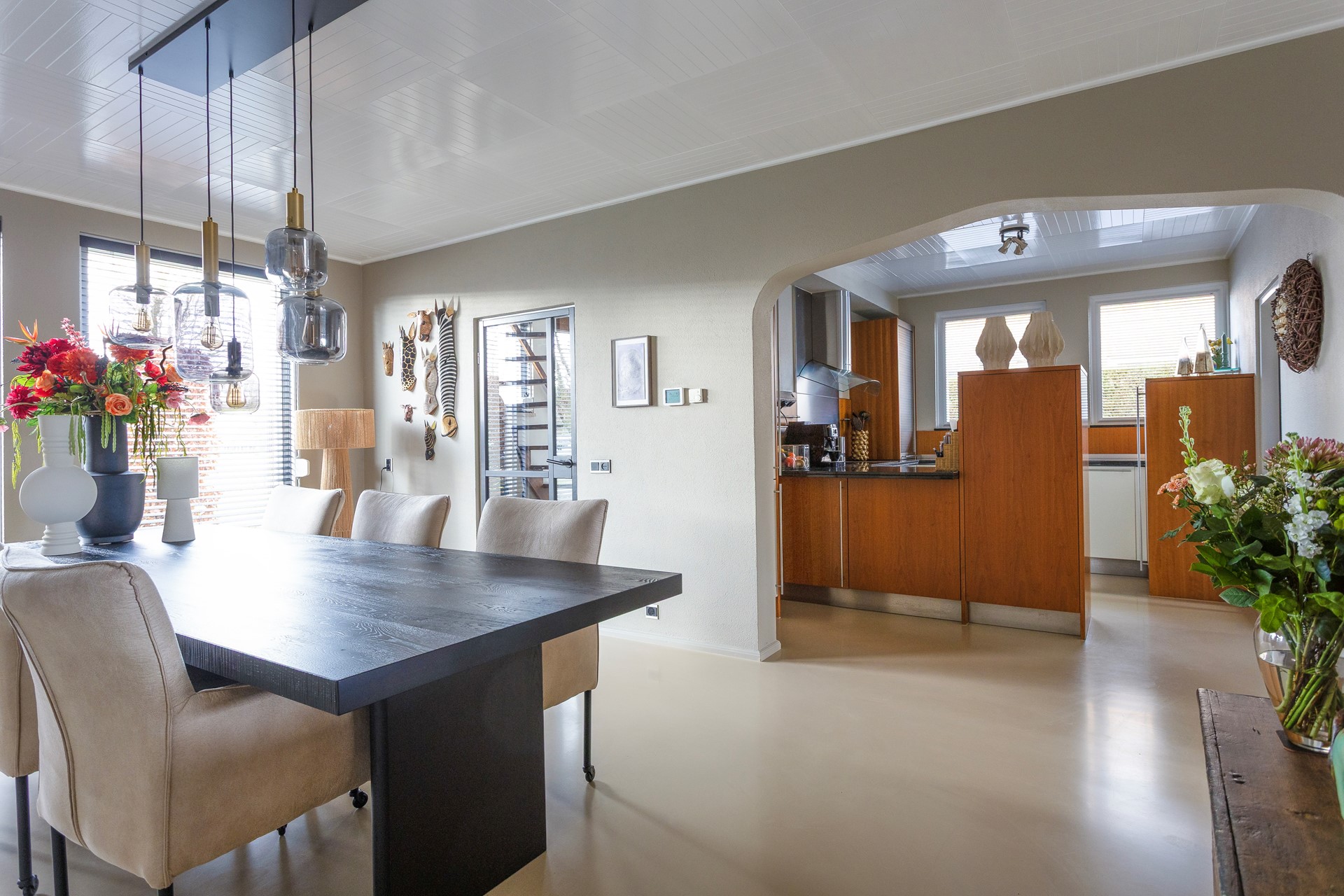 • De gehele begane grond afgewerkt met een lichtgekleurde gietvloer en vloerverwarming. De wanden zijn afgewerkt met lichte spachtelputz en plafonds met lichte