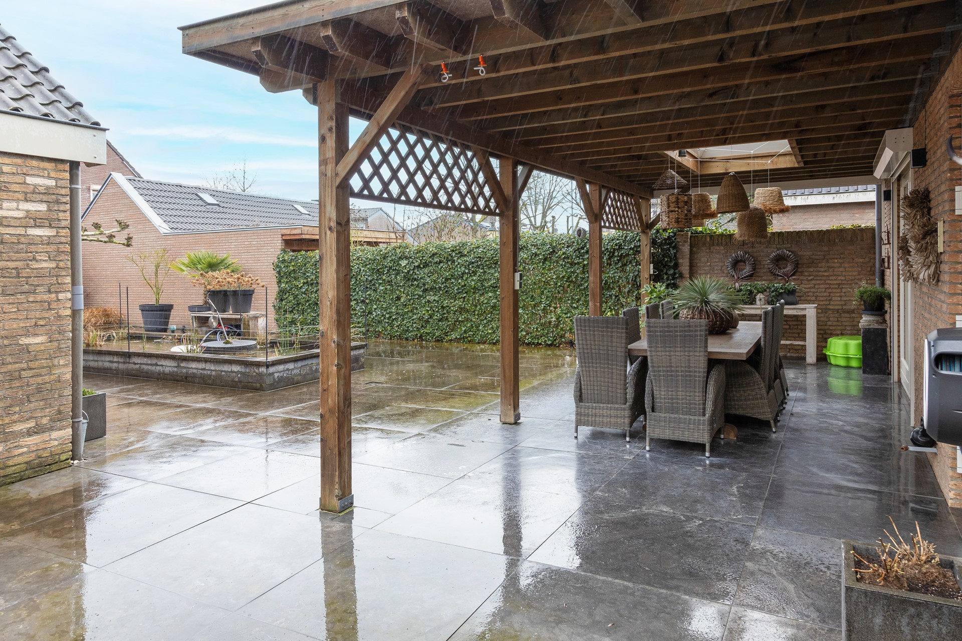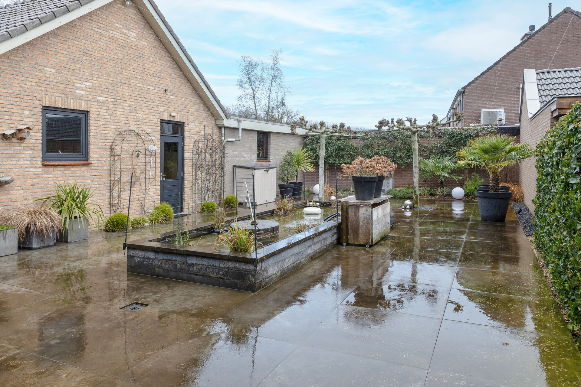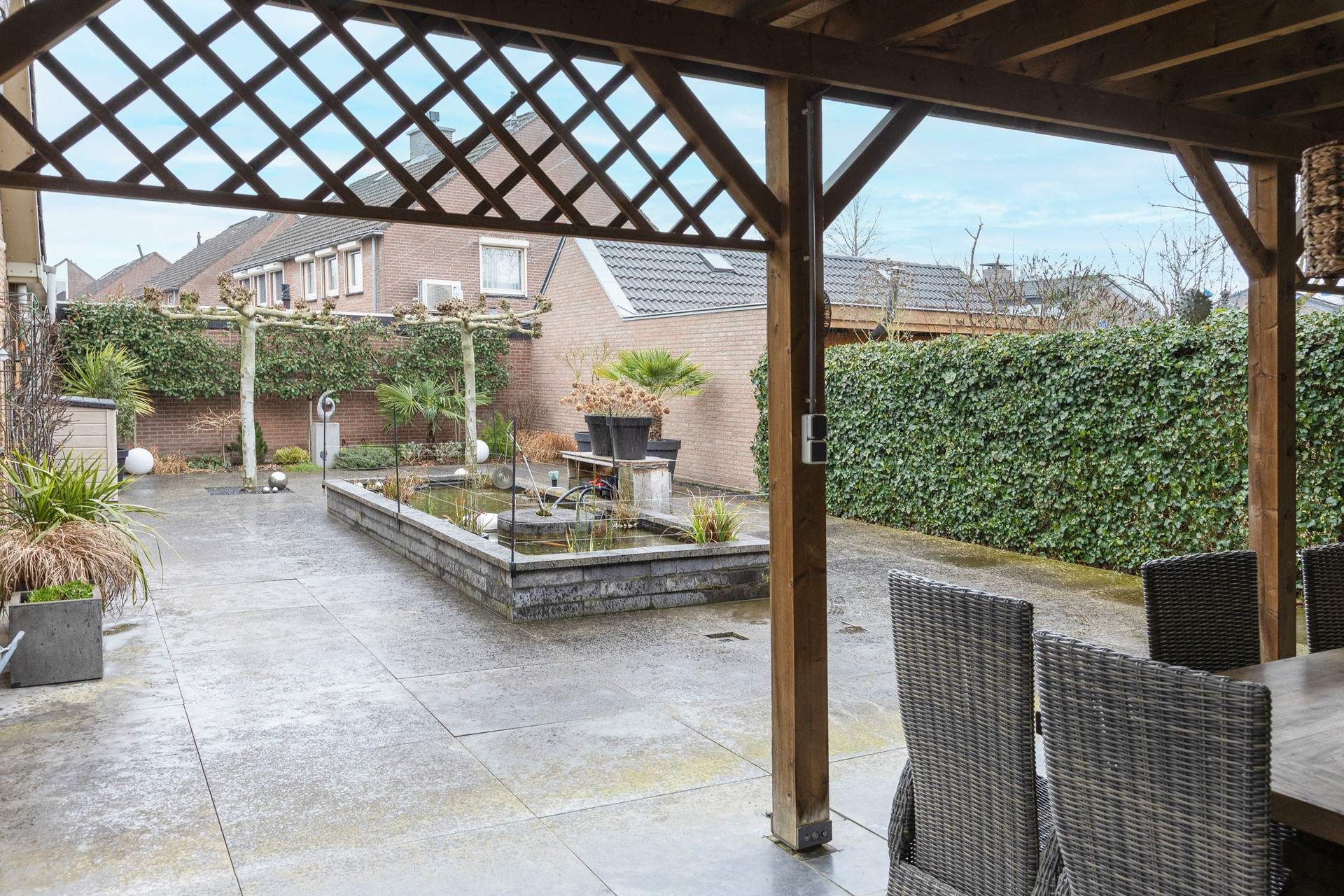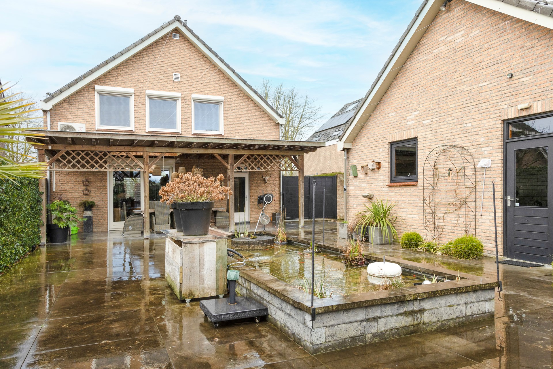 Deze woning heeft een tuin aan de voor- en achterzijde; aan de zijkant een royale oprit met een deel achter een dubbele poort en toegang tot de grote garage. Grenzend aan de eetkamer is de veranda geplaatst, een prettige plek om beschut buiten te zitten; de tuin geeft veel privacy en is ingericht met grote tegels (natuursteen), perken en een vijver; de ligging is zuid-oost, een prima plek voor de zon. De voortuin is eveneens met perken en grind aangelegd en geeft een vrij uitzicht op groen.